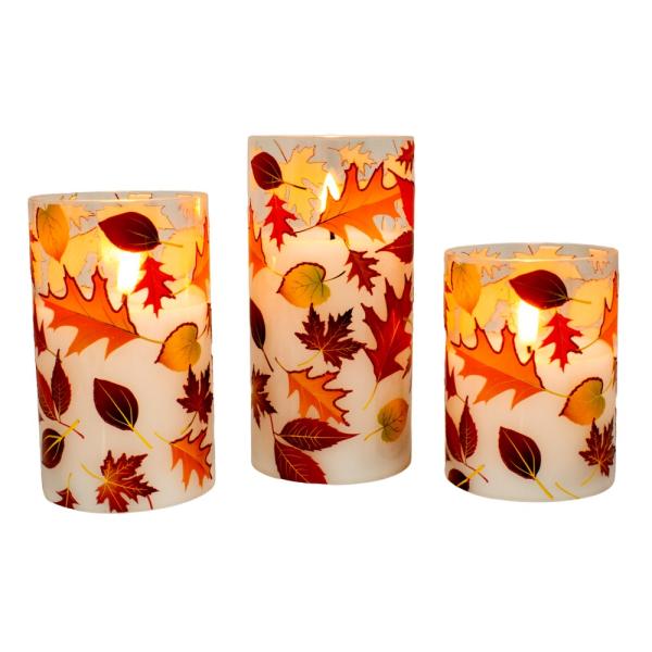 Our beautifully crafted 3 piece flameless LED iced glass, wax filled pillar set comes in 3 sizes. Each 4 inch, 5 inch and 6 inch pillar features a fall leaf design. The candles include a safe, battery operated LED that flickers and glows like real candlelight minus the hazards of an open flame or melting wax. As an added bonus, each pillar includes an automatic timer, that when set, conveniently turns on at the same time every day for 6 hours and off 18 hours.